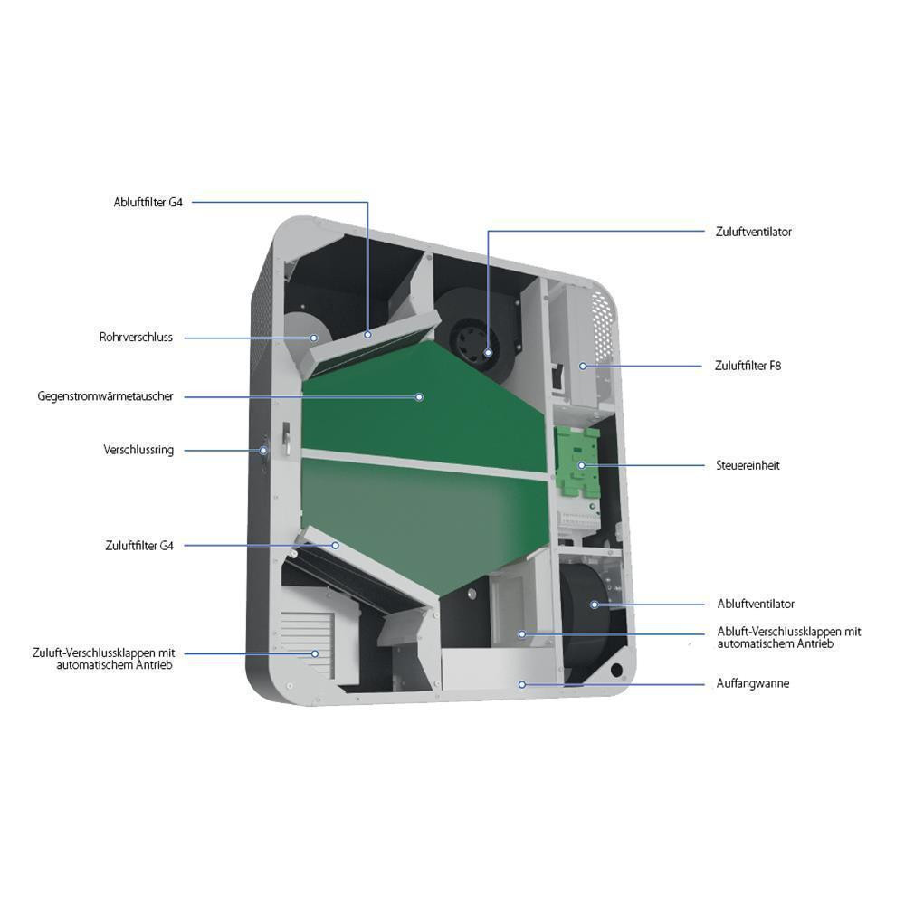 Die Zuluftfilterung erfolgt über G4 und F8 Filter. Optional sind H13, F8 Aktivkohlefilter erhältlich.