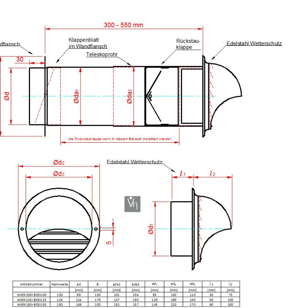 - Mauerkasten für z.b. Dunstabzug mit Teleskoprohr und Edelstahl Wetterschutz mit Haube und Rückstauklappe weis MKWSKE-BDSI-W